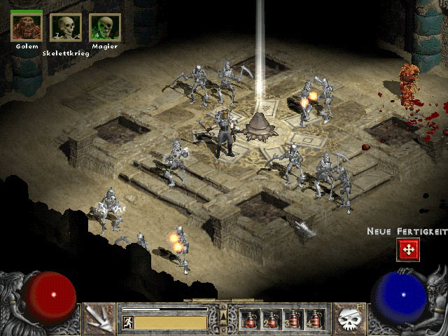 Was ist ein Necromancer? Nun, zu allererst gehört er zur Gattung der Magier. Demnach beherrscht er schon mal wirkungsvolle Zaubersprüche. Wie bei Everquest steht dem Necromancer auch bei Diablo 2 ein Skelett hilfreich zur Seite, wobei man hier je nach Skillverteilung auch mehrere dieser untoten Burschen sein Eigen nennen darf und zusätzlich noch diverse Golems um sich scharren kann. Mit dem Totenbeschwörer legt man sich also eine passive Vernichtungsmaschinerie zu, die einem durchaus