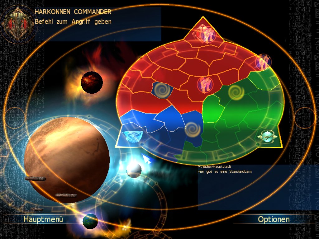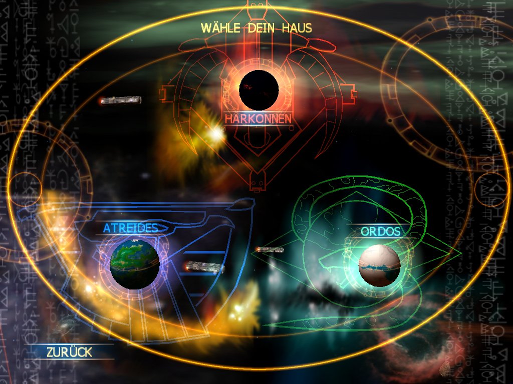 Wie man es von allen Spielen aus dem Hause Westwood gewohnt ist, wird man als Konsument mit massig Videosequenzen beglückt, die schon bei der Auswahl der drei Häuser zu sehen sind und daher gleich zu Anfang eine wirklich nette Stimmung aufkommen lassen. Im Laufe des Spiels werden dann noch einige Missionsbeschreibungen mit Videosequenzen untermalt - doch mehr als rund 10 Stück gibt's bei keinem Haus. Alles weiteren Aufträge werden mit Text- und Sprachausgabe erklärt. Wie schon bei Dune 2 üblich, wird vor jedem neuen Gefecht eine Karte von Dune eingeblendet, die in einzelne eingefärbte Abschnitte unterteilt ist. Jede Farbe repräsentiert eines der Häuser und zeigt damit an, wem welche Gebiete gehören. Anders als beim Vorgänger hat man bei Emperor allerdings wirklich die Auswahl zwischen mehreren Gebieten, die man erobern kann. Da bei der neuesten Dune Auflage noch einige Untergruppen wie die Häuser IX & Tleilaxu, sowie des Imperators Sardaukar und die Ureinwohner Fremen dazugekommen sind, hat Westwood versucht, die Missionen der einzelnen Kartenabschnitte etwas interessanter zu gestalten, indem man z. B. den IX helfen soll, sich bei den Tleilaxu zu rächen und man im Gegenzug deren Technologie oder Kampfunterstützung in den nächsten Missionen erhält. Alles in allem eine gute Idee - doch in ihrer Ausführung oftmals nicht so perfekt geraten. Da geraten Text- und Sprachausgabenschnipsel manches mal durcheinander, der Ausgang einer Mission ist teilweise völlig irrelevant, weil man auf die Hilfe der Unterhäuser eh meist verzichten kann u.s.w. - die Gefechte laufen im Endeffekt dann doch immer darauf raus, einfach die Karte einzunehmen. Nach jedem Kampf sind die anderen Häuser am Zug, wobei mindestens eines der Häuser versucht, eines unserer Gebiete zu erobern - ein Optionsmenü lässt dem Spieler die Auswahl zwischen der Verteidigung oder der Aufgabe des Gebietes.